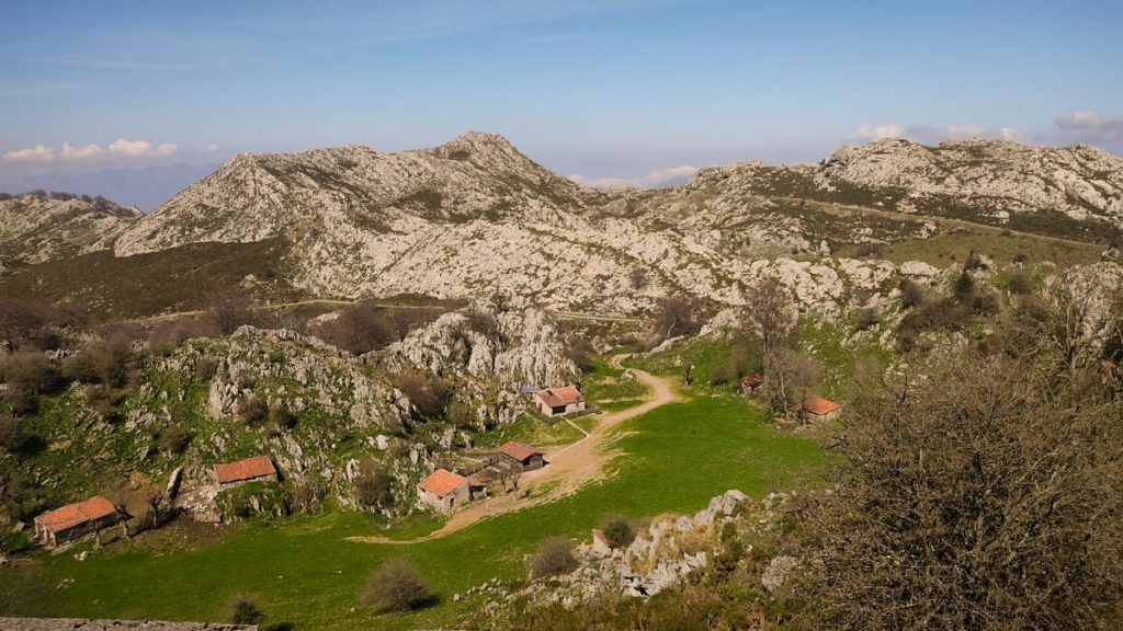 Por suave ladera alcanzamos el Mirador Entrelagos: el Ercina al este y el Enol al oeste. Desde este mirador vamos bajando hacia el aparcamiento con la vista puesta en el Enol y en el inicio de la vega del mismo nombre con las edificaciones pastoriles esparcidas por el praderío y siempre flanqueadas de varios fresnos.