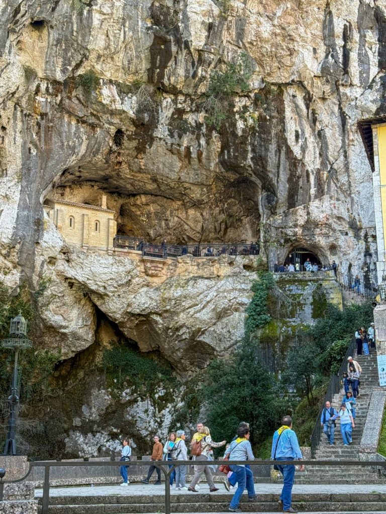 Ya en Covadonga fue obligada la visita a la Cueva de la Santina, la basílica y la tumba y monumento al Rey Pelayo. La basílica es un edificio esbelto, del siglo XIX; el primer dibujo-proyecto se encargó a Roberto Frasinelli (curioso personaje conocido como el “alemán de Corao”, pues en ese pueblo estableció su residencia y aún puede verse lo que fue su noble casa) que desarrolló variadas actividades, todas relacionadas con la cultura y el patrimonio. Pero este enclave tiene bajo la Cueva que ahora alberga a la patrona de Asturias, una llamativa cascada que origina el arroyo Deva (antigua divinidad celta). Así que este lugar ya estaba sacralizado mucho antes de que apareciera el dominio de la cristiandad, de hecho, Covadonga, según sólidas teorías lingüísticas, derivará de “cova” (fuente) “onna” (río) “onnika”.