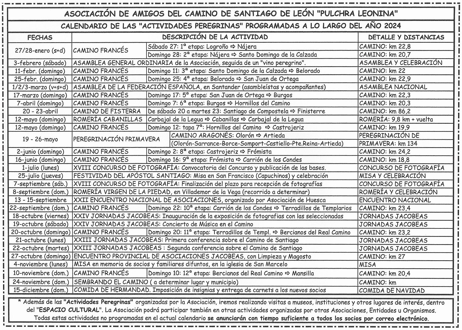 Ya tenemos en nuestro poder el calendario de actividades «PEREGRINAS» programadas para el año 2024, por la Junta Directiva de la Asociación de Amigos del Camino de Santiago de León «Pulchra Leonina».