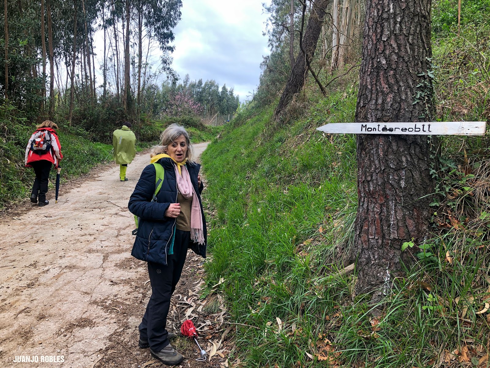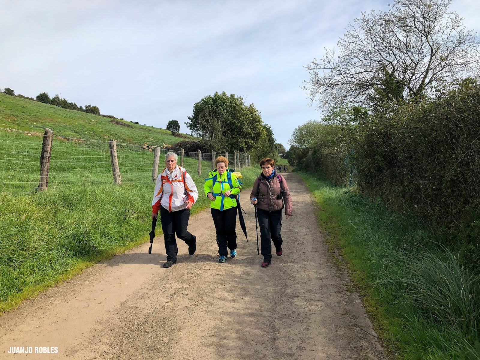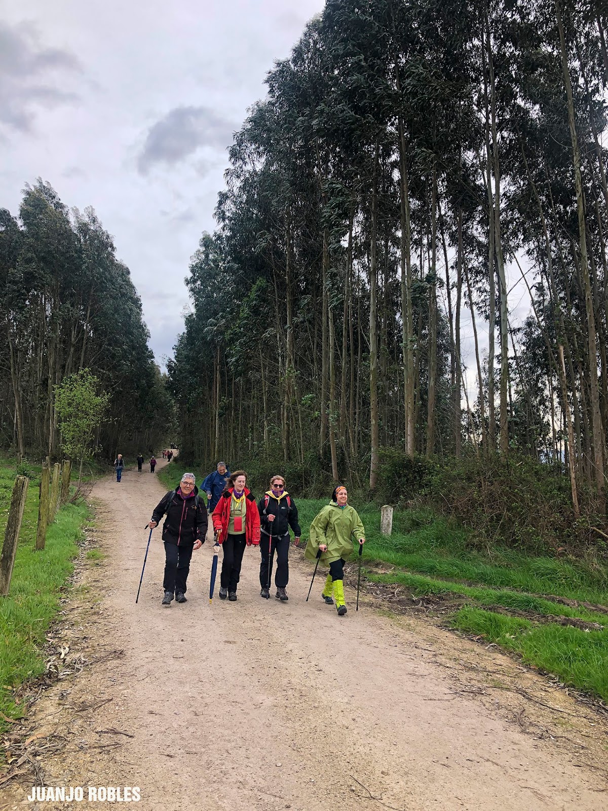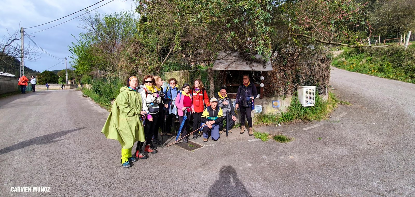 Empezamos la etapa con lluvia. En nuestra subida hasta el Monte Areo nos acompañarán los chubascos con períodos secos. Quien escribe estas humildes líneas, lleva un paraguas, muy viajado -por cierto, comprado en Utrera (Sevilla)- y cuyo objetivo no era otro que espantar la lluvia. Y así ocurrió! Salió el sol, eso sí, caminando acompañados de un fuerte viento la mayor parte de las veces de cara, que dificultaba en ocasiones nuestro avance.