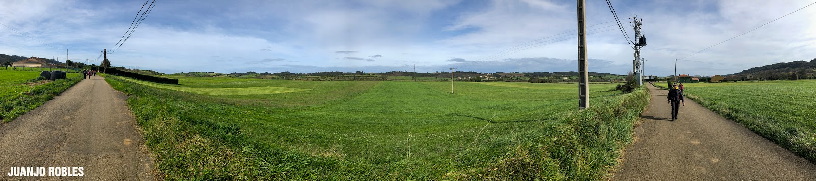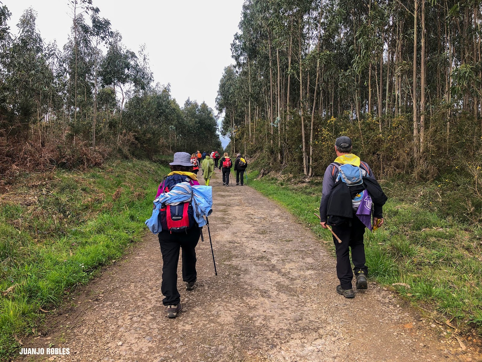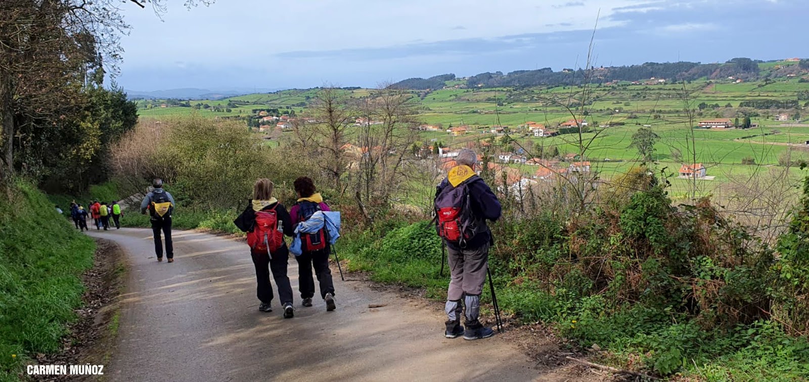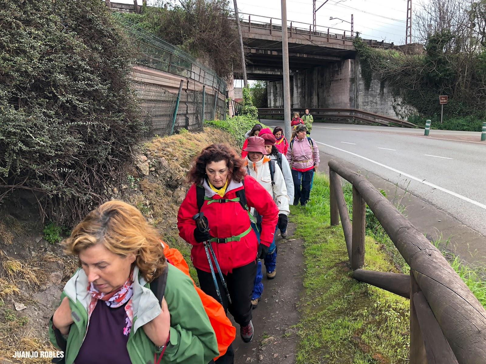 Empezamos la etapa con lluvia. En nuestra subida hasta el Monte Areo nos acompañarán los chubascos con períodos secos. Quien escribe estas humildes líneas, lleva un paraguas, muy viajado -por cierto, comprado en Utrera (Sevilla)- y cuyo objetivo no era otro que espantar la lluvia. Y así ocurrió! Salió el sol, eso sí, caminando acompañados de un fuerte viento la mayor parte de las veces de cara, que dificultaba en ocasiones nuestro avance.