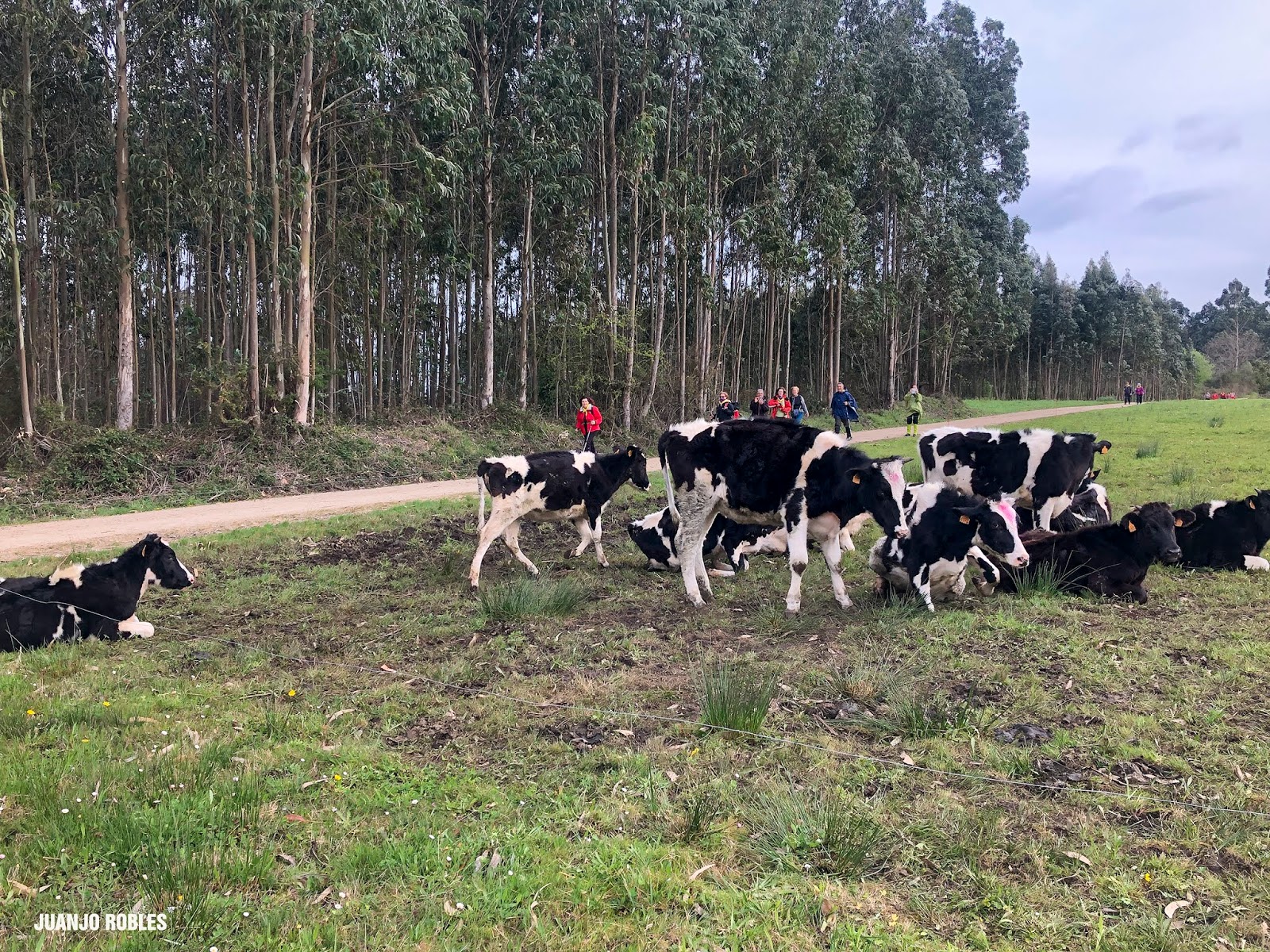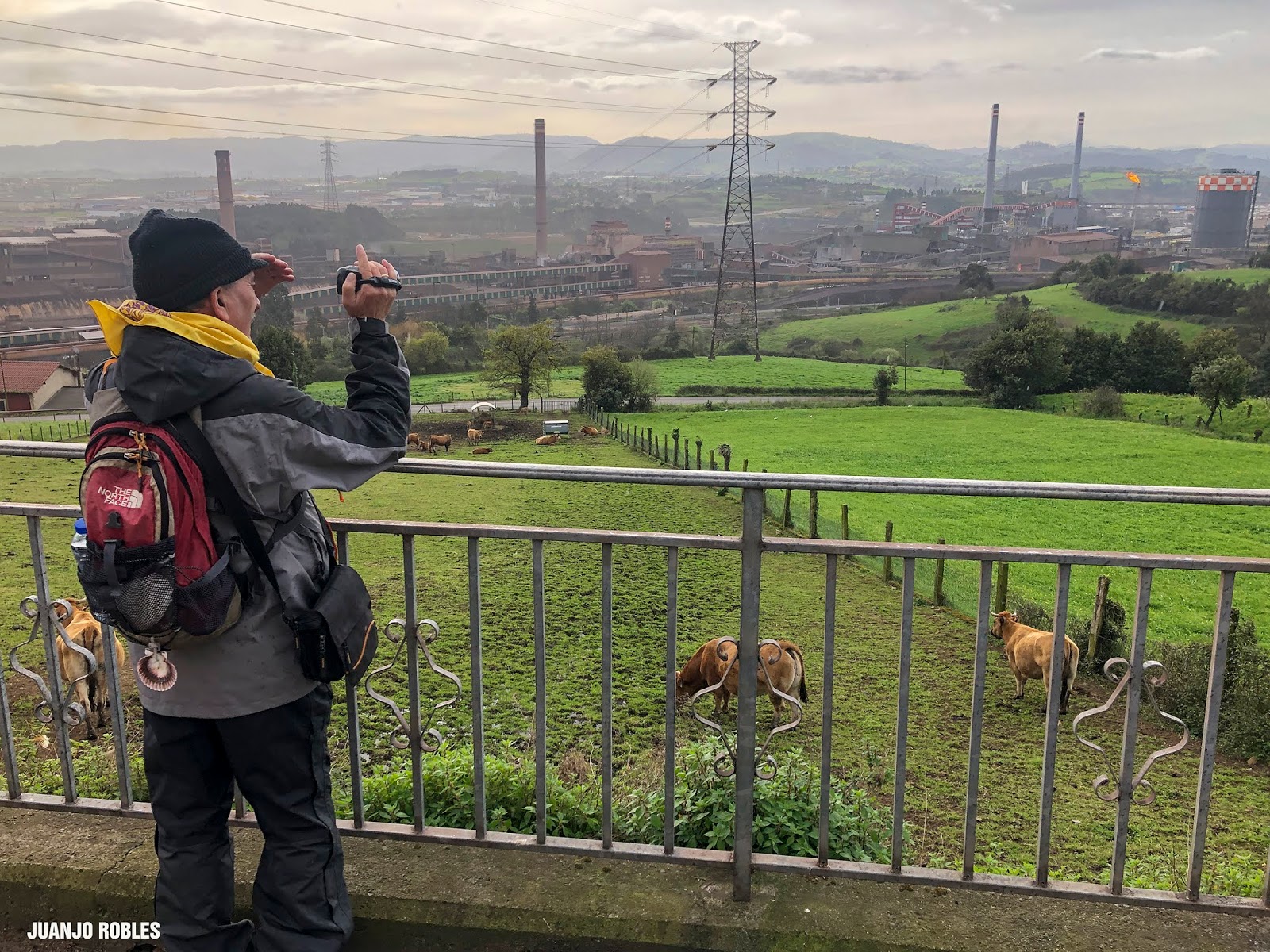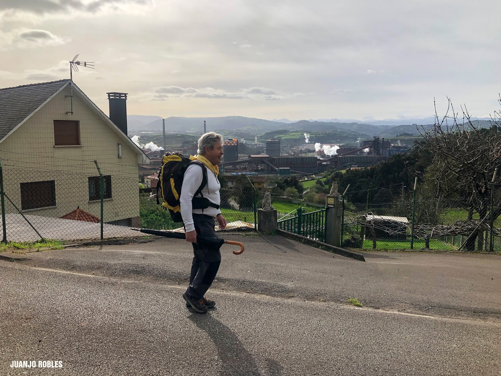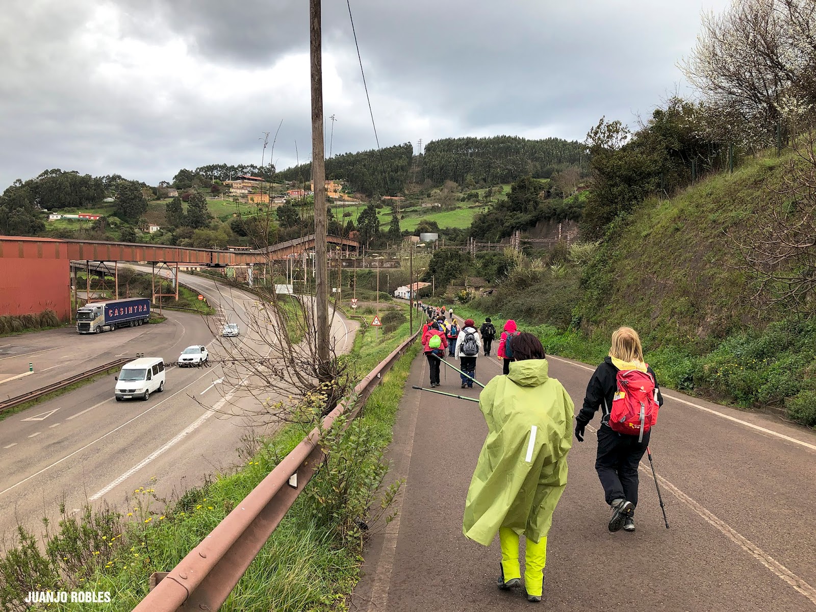 Empezamos la etapa con lluvia. En nuestra subida hasta el Monte Areo nos acompañarán los chubascos con períodos secos. Quien escribe estas humildes líneas, lleva un paraguas, muy viajado -por cierto, comprado en Utrera (Sevilla)- y cuyo objetivo no era otro que espantar la lluvia. Y así ocurrió! Salió el sol, eso sí, caminando acompañados de un fuerte viento la mayor parte de las veces de cara, que dificultaba en ocasiones nuestro avance.