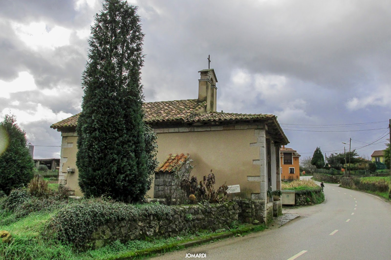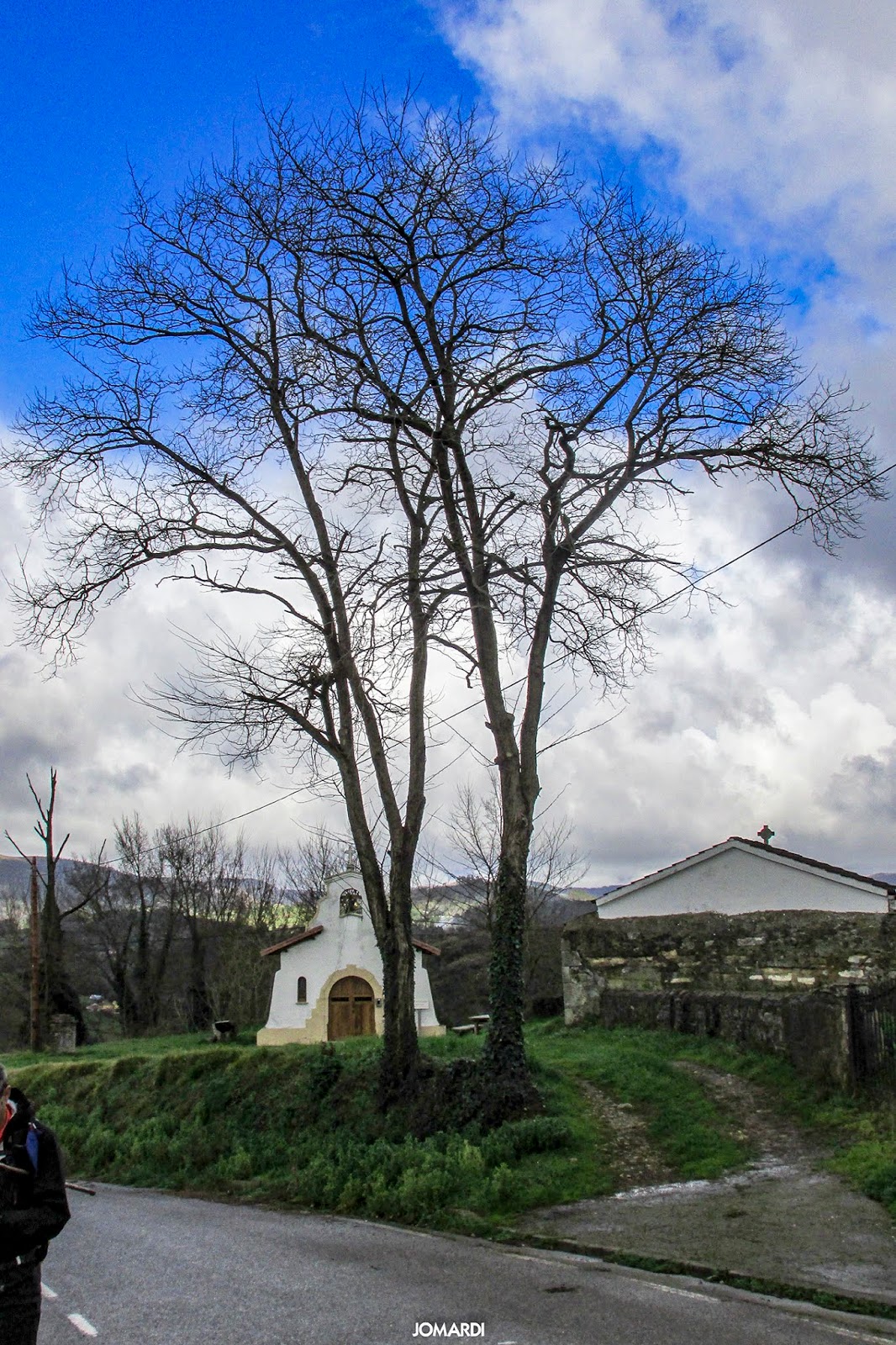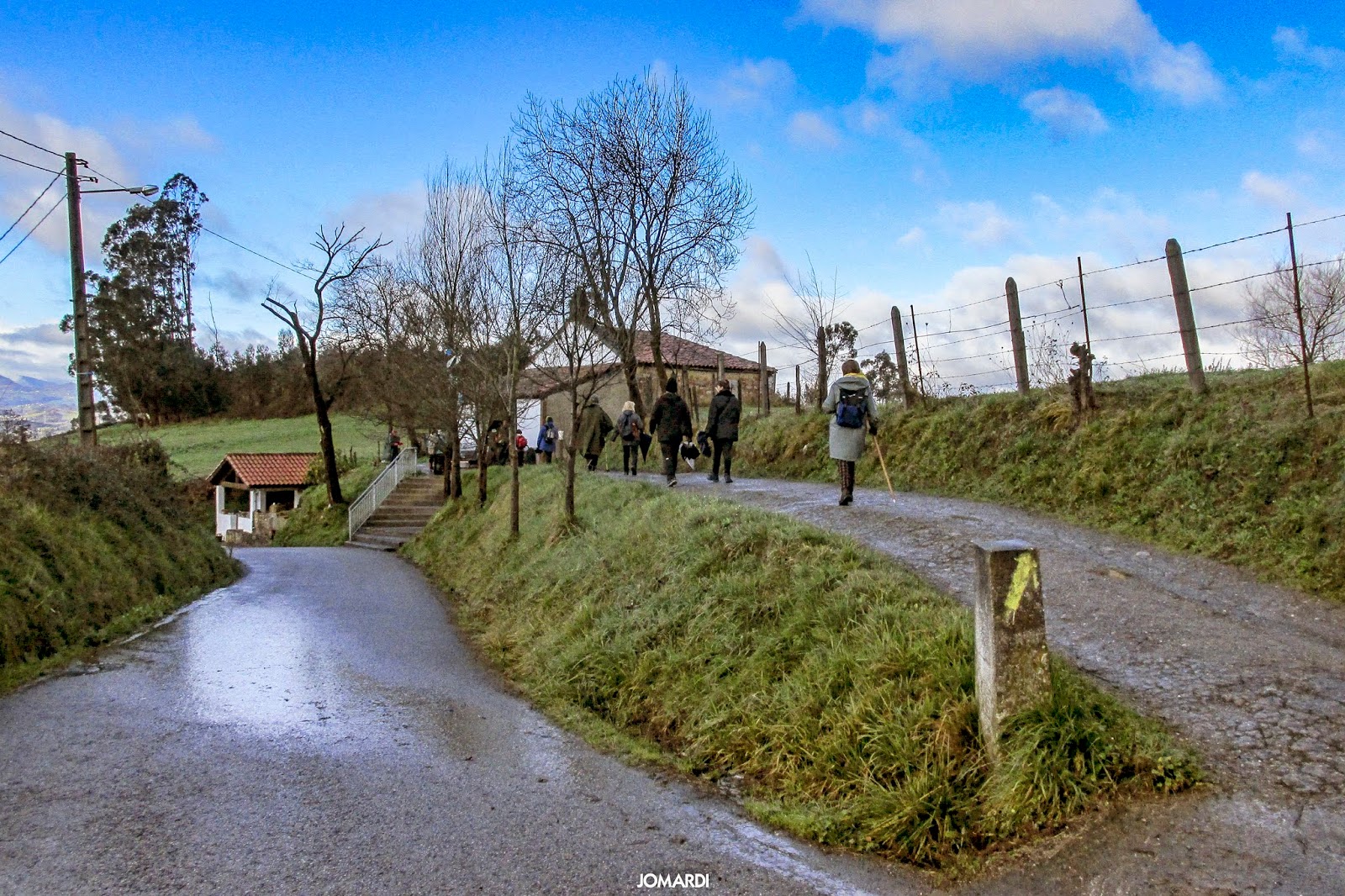 Con la capa-impermeable puesta iniciamos el primer tramo Oviedo-Premoño de 13’6 Kms. Por la C/ Muros de Nalón, salimos a una carretera que nos lleva a San lázaro de Paniceres, donde nos han dicho que hay unas bonitas vistas de cara al Naranco, hoy solo vemos un cielo gris plomizo. Por unas pistas y senda de hojas y barro nos llegamos a la ermita del Carmen de Llampaxura, allí sellaremos por 2ª vez, tras el sellado de la catedral.