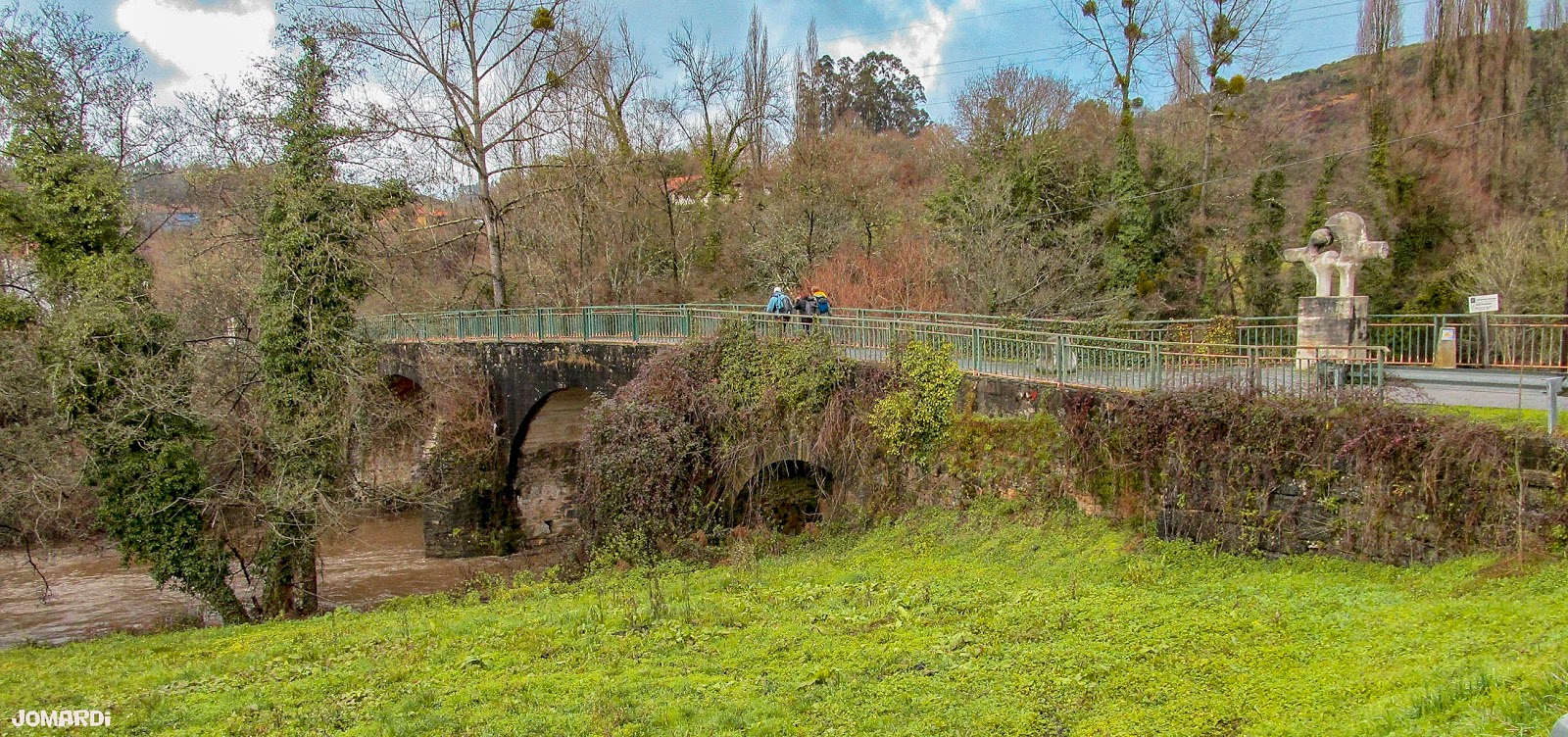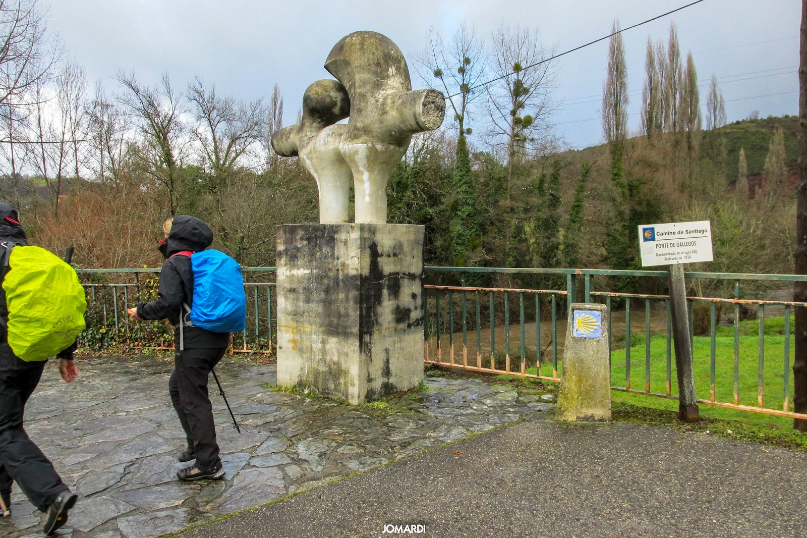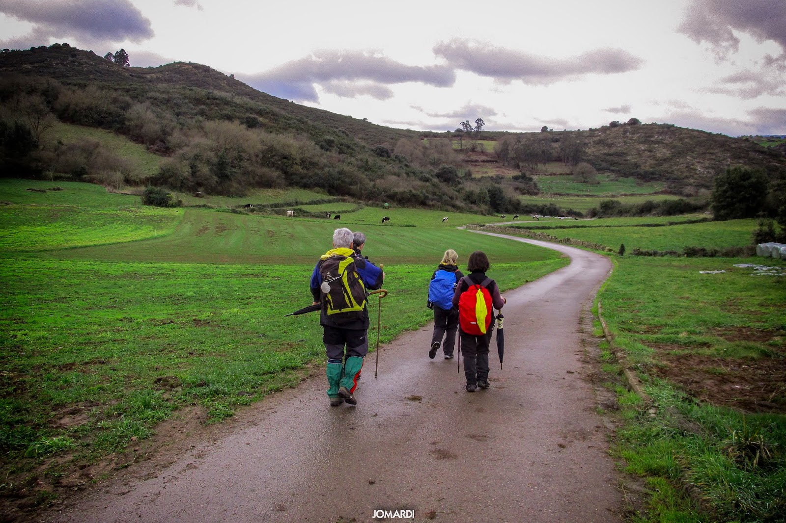 Nada más entrar en el pueblo torcemos a la derecha por un paisaje bonito, que intuimos precioso en primavera y otoño, castaños, robles y frutales nos acompañan en esta senda llana de 8’9 Kms. Hemos perdido mucho tiempo en Oviedo, por lo que nadie se desvía a ver las termas romanas de Valduno, seguimos por el valle del Nalón , cruzando un impresionante puente de Peñaflor, llegaremos a Grado 3 Kms después, no sin recibir en este último tramo el chaparrón más importante del día.