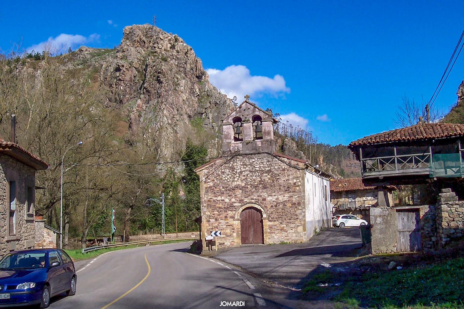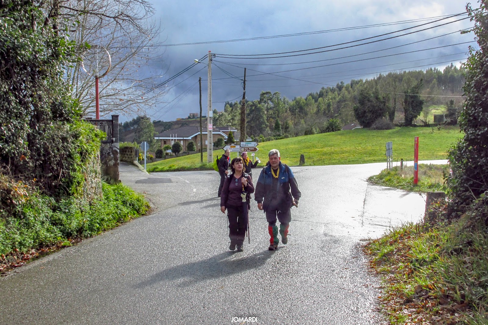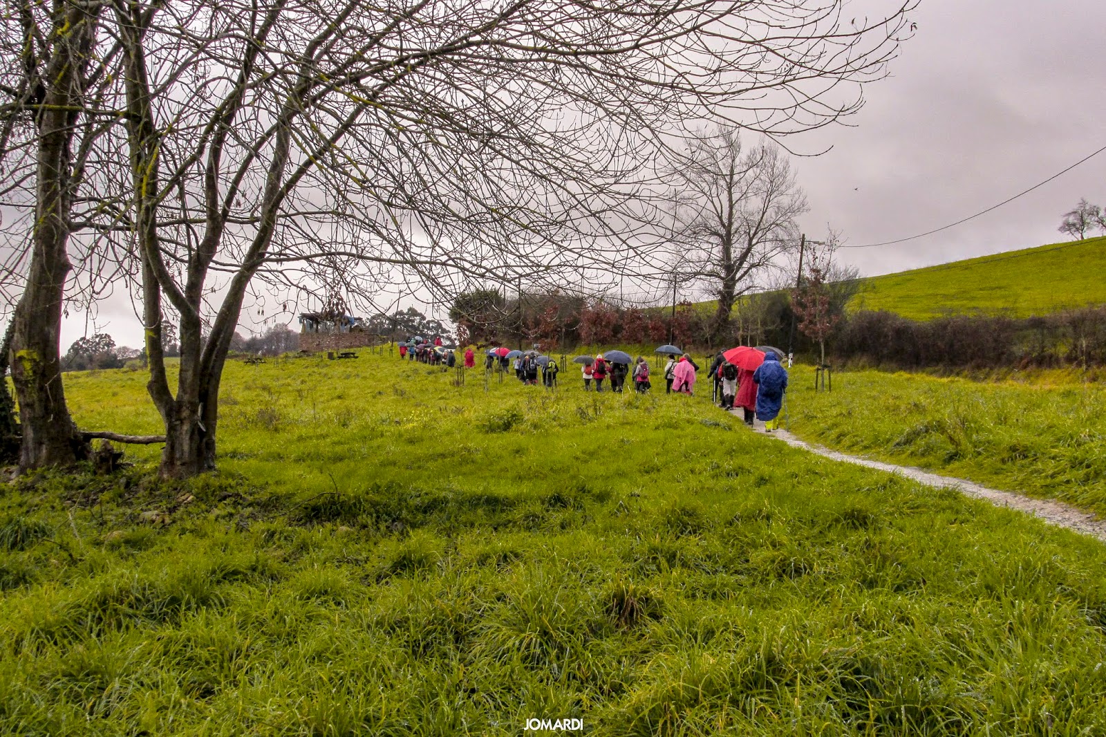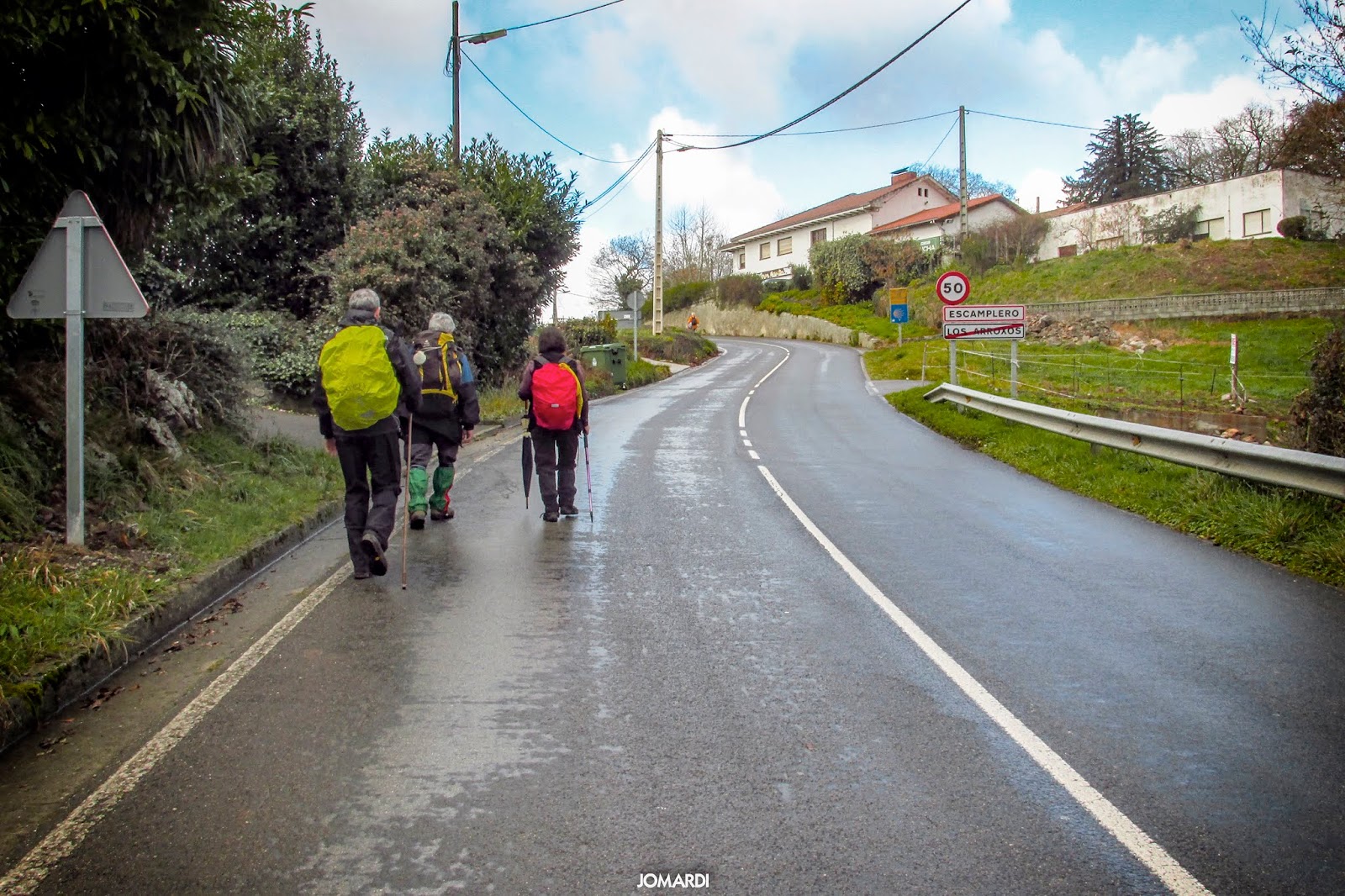 Poco después se cerrarán los paraguas, las capas volverán a las mochilas y aunque de vez en cuando cae algún pequeño chaparrón, hay grandes tramos de cielo azul y nubes que ni en los mejores sueños imaginamos. Cruzamos el puente Gallegos sobre el río Nora, afluente del Nalón y dejamos atrás el municipio de Oviedo, para adentrarnos en el de Las Regueras. Una bonita aunque pedregosa  senda nos encamina al Castañeu del Soldau y el molín de Quintos, allí comenzaremos una larga subida ( 3 Kms. ) hasta Escamplelo, aquí se disgregan  los  grupos, la velocidad del paso es la culpable, hay momentos en que me veo solo y otros que al torcer una curva encuentro algún compañero.