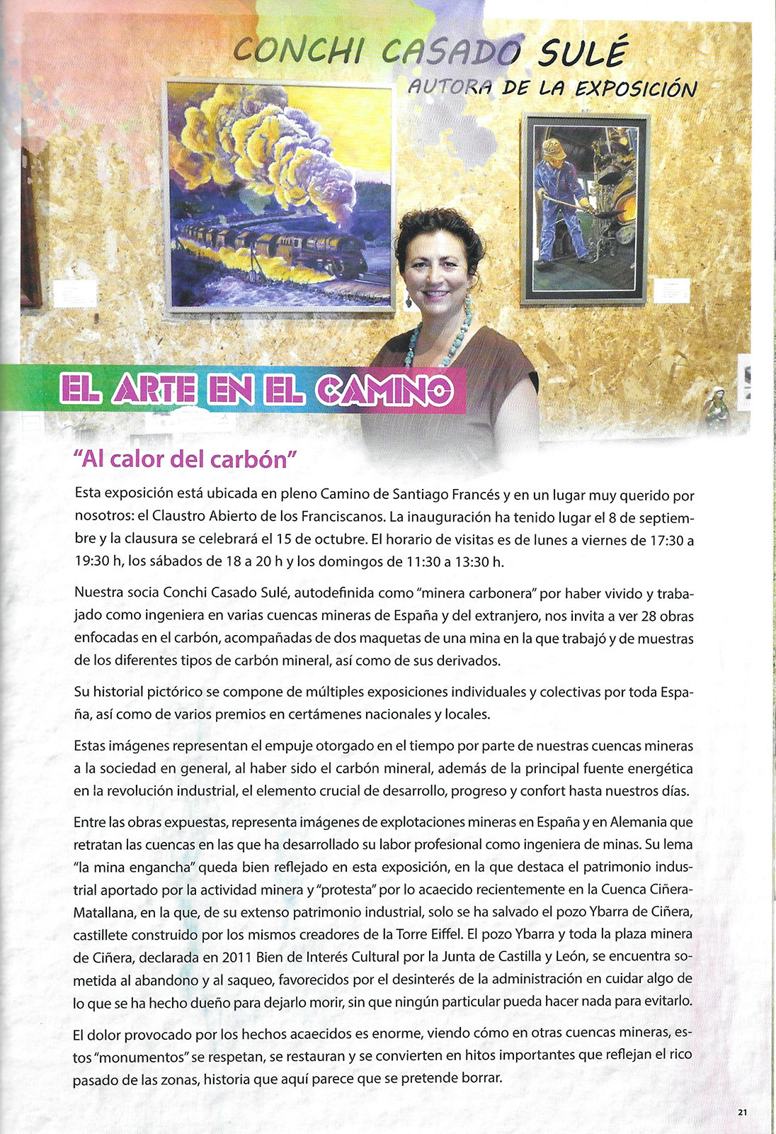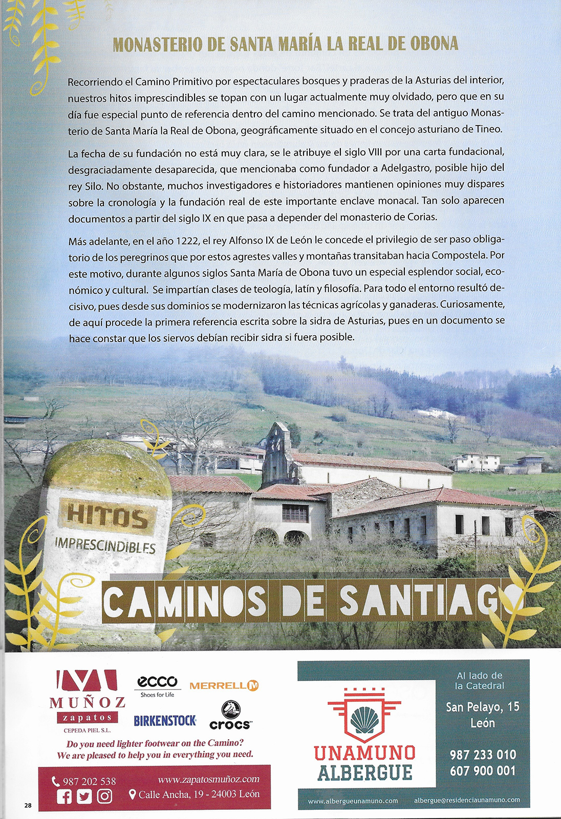 La secciones Historia, de nuestra compañera Mari Ángeles Zayas , sobre Molinaseca y su leyenda y Arte en el Camino, este vez con la crónica de la maravillosa exposición de pintura de nuestra compañera y directora de El Senderin, Conchi Casado, que permanecerá abierta hasta el 15 de esta mes en el Claustro del Monasterio de los Franciscanos, dan paso a las lecturas emocionales de Ángel Herranz, a ¨Reflexiones al hilo de mis pasos ¨de Ana Cristina López y  a la sección ¨Los libros del Camino¨ de  Antonio Otero y para finalizar junto a los pasatiempos y poesía, el magnífico reportaje sobre el Monasterio de Santa María la Real de Obona de Ramón Carlos Fraile Lozano.