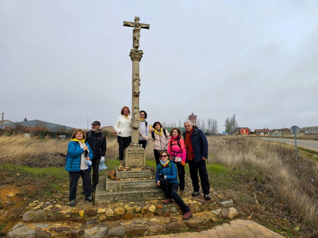 El tercer grupo, compuesto fundamentalmente por mujeres, aunque también va algún compañero, es el más corto, poco más de 7 kilómetros. Por una senda que aparentemente y vista desde el autobús, parece limpia, pero como dice el refrán “ el que busca halla “. Debajo o semi oculto tras la hojarasca otoñal que alfombra el camino, van encontrando restos del paso del peregrinaje y disfrutando de los hoy tristes parajes de los terrenos de secano de la zona. A la derecha dejarán un par de espacios de descanso con merenderos y la ermita de San Isidro, que pertenece al pueblo de Villamarco, situado a escasos quinientos metros del Camino de las Estrellas.