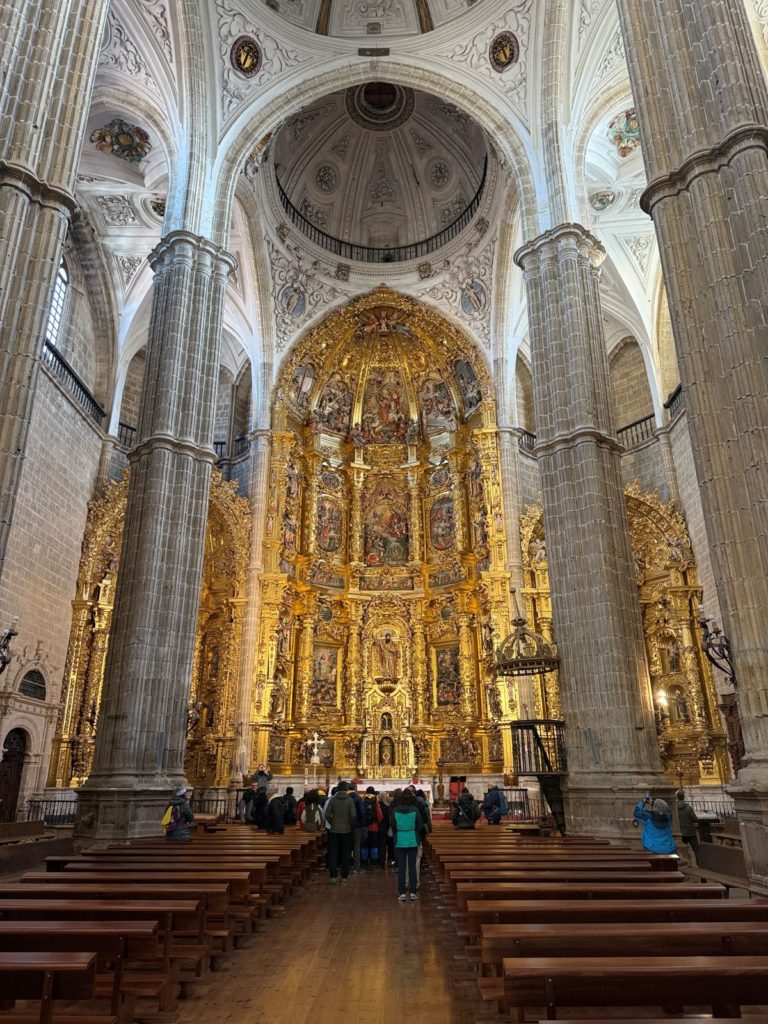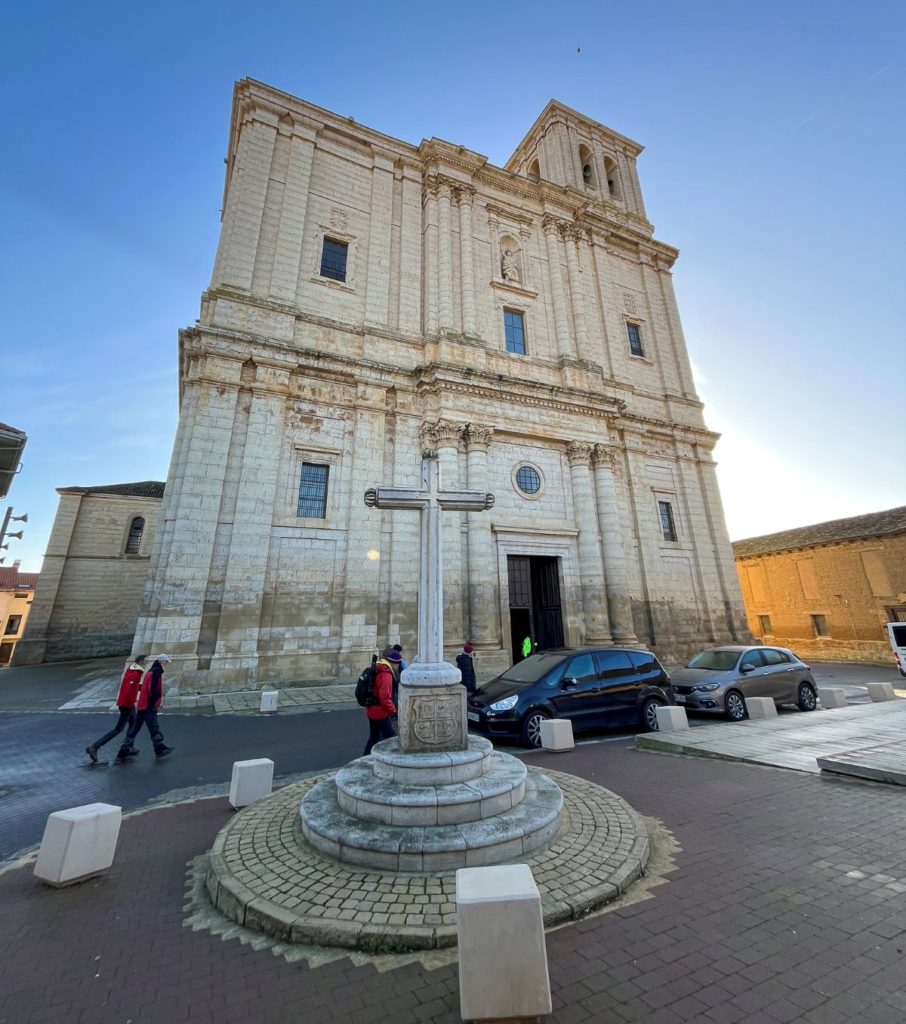Allí no solo sellamos credenciales, sino que disfrutamos de una auténtica joya arquitectónica. El templo, de base gótica, combina estilos debido a los 150 años que duró su construcción. Destacan: la plateresca fachada sur, la fachada principal que es clasicista, las tres naves con altas bóvedas sostenidas por 20 columnas de 35 metros, el Coro con un precioso órgano policromado y el retablo mayor de estilo barroco y que está coronado por el célebre “Santiago Matamoros a caballo”, evocando como leyenda, la batalla de Clavijo.