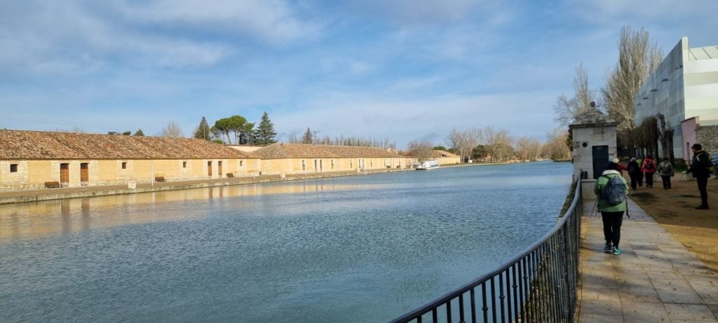 Sin más demora, y antes de partir, nuestro presidente impuso el pañuelo amarillo, símbolo de nuestra Asociación “Pulchra Leonina”, a nuestro anfitrión como gesto de agradecimiento y fraternidad jacobea. Tras este pequeño pero significativo acto, nos dirigimos a la dársena donde finaliza el Ramal de Campos del Canal de Castilla, obra pública terminada en 1849 y casi un siglo de trabajos. Está concebida para transportar cereal y lana hacia el norte, convirtió a la villa en un núcleo clave de comercio e ingeniería ilustrada. Hoy es Bien de Interés Cultural y un atractivo turístico de primer orden.