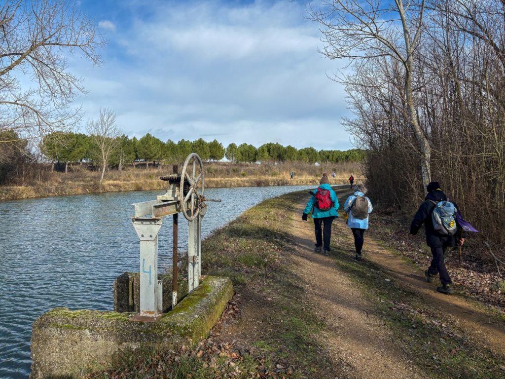 Entonces comenzamos a caminar paralelos al canal, entre choperas desnudas, con la llanura castellana desplegada ante nosotros y un tiempo tranquilo y algo despejado. Pronto divisamos, a nuestra derecha, la imponente iglesia de Villanueva de San Mancio y, más adelante, la torre del Castillo de Belmonte de Campos, vigía silenciosa del pasado.