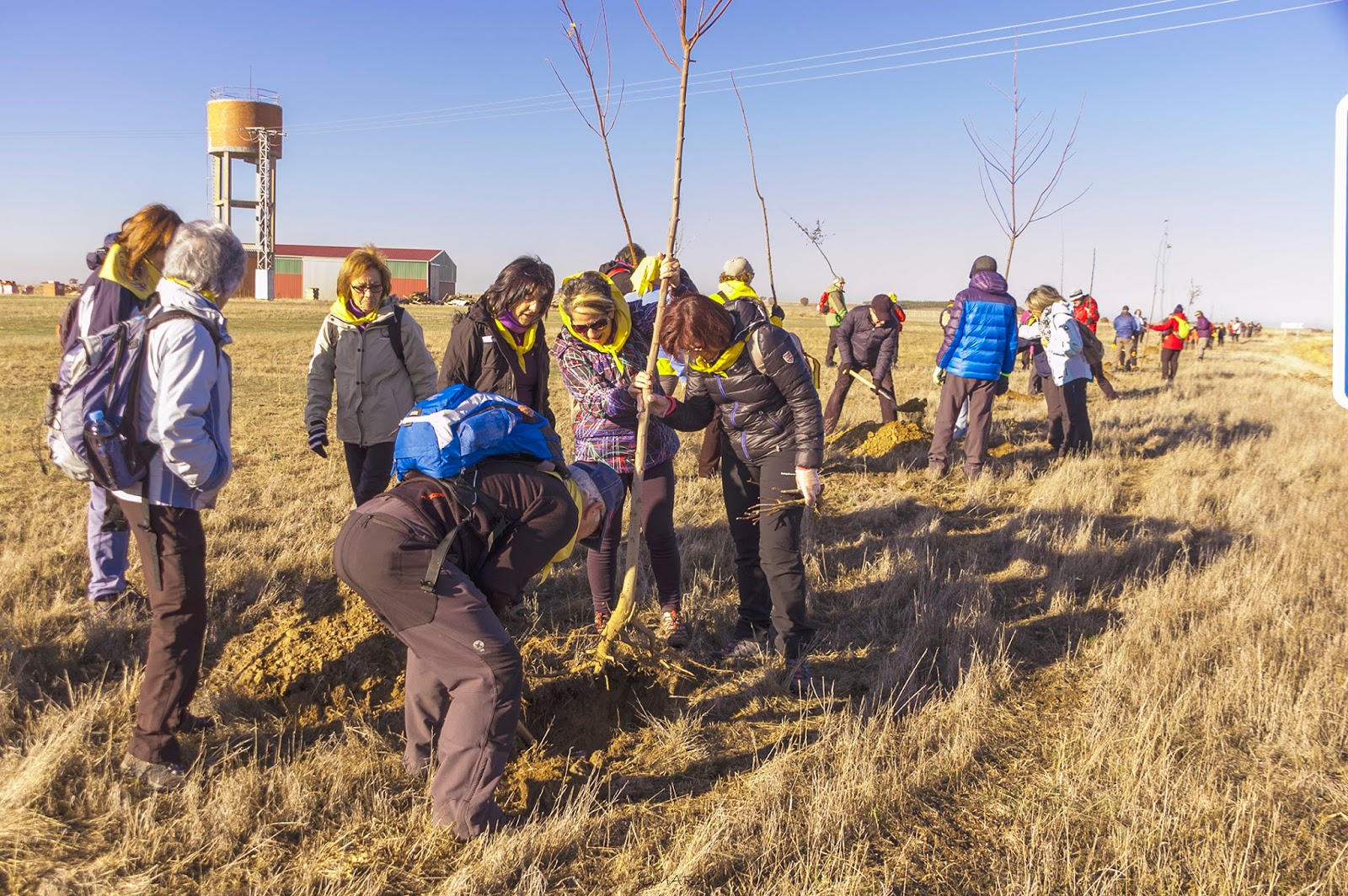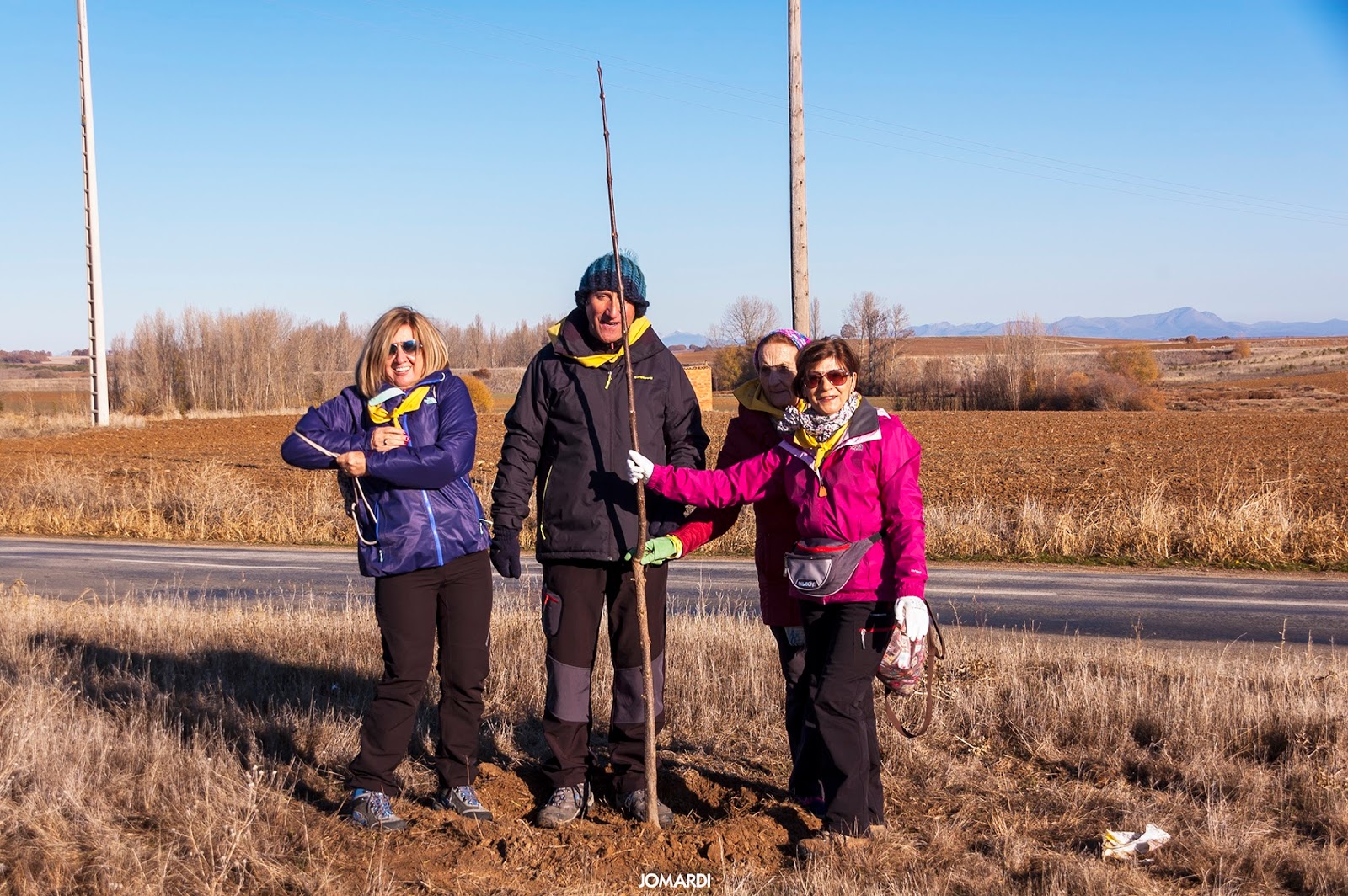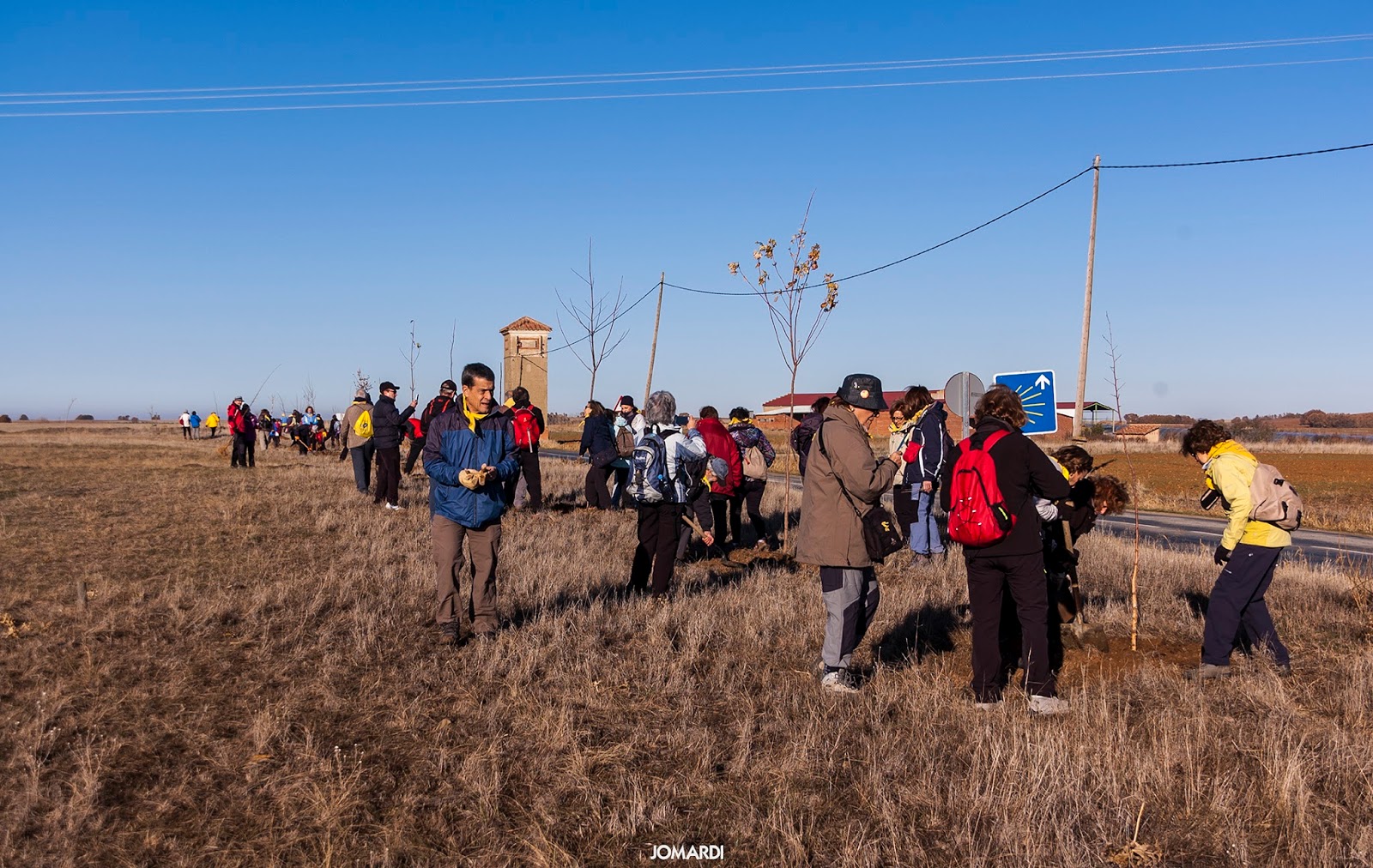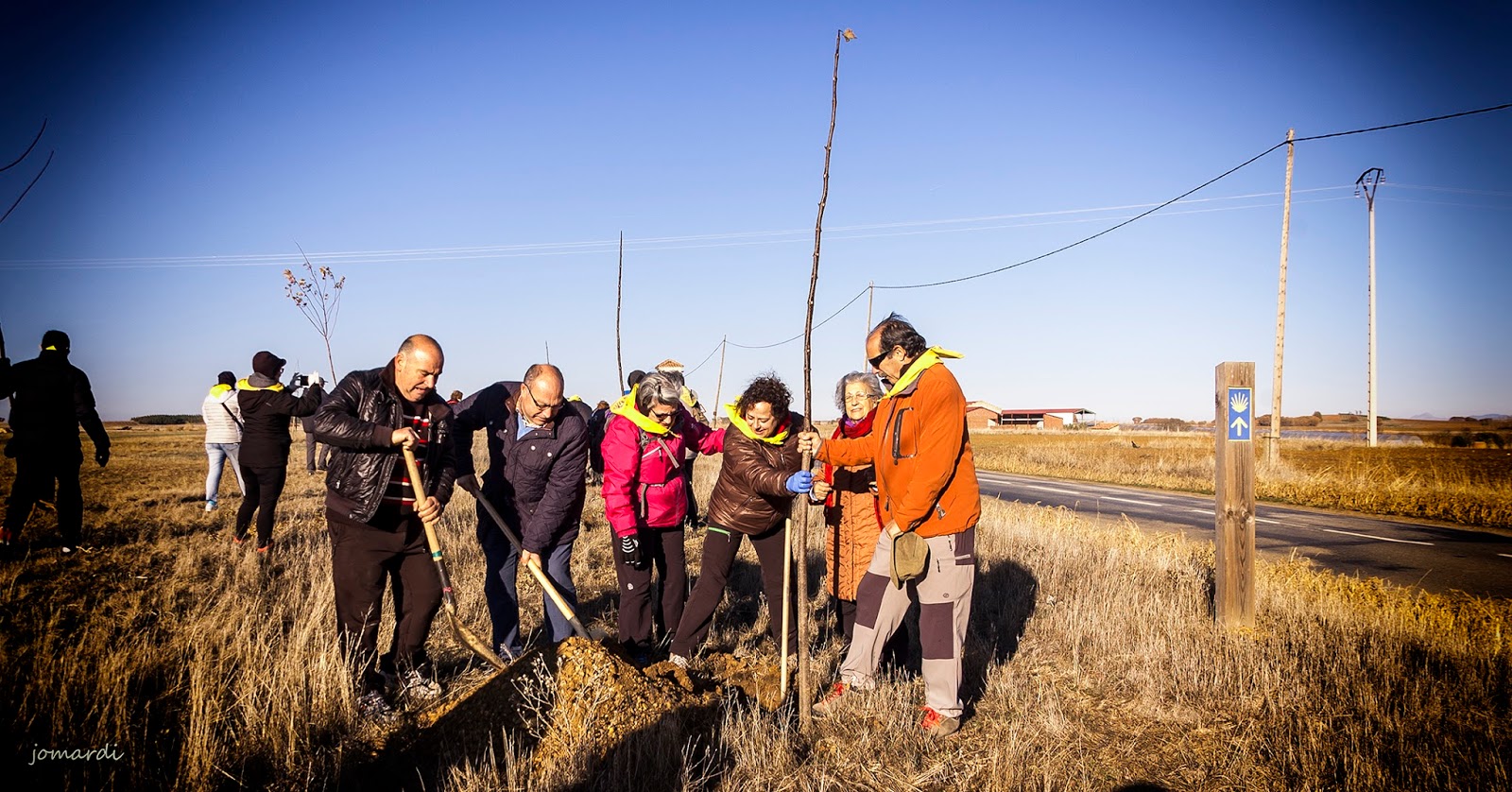 Este año nuestra siembra transcurrió por la denominada «Calzada de los Peregrinos», que sigue con bastante fidelidad el trazado de la «Vía Trajana». Comenzamos el Calzadilla de los Hermanillos y terminamos en Calzada del Coto. Al llegar a Calzadilla nos esperaba el diputado de turismo y el alcalde del Burgo Ranero, que nos tenían preparados los hoyos para los 30 árboles -entre arces de Montpellier, robles y encinas – que fueron cedidos por la Diputación de León.