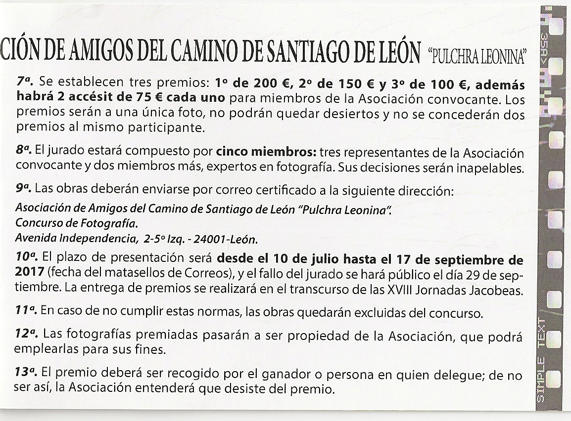 Avenida Independencia, 2-5o Izq. – 24001-León. - 10.ª El plazo de presentación será desde el 10 de julio hasta el 17 de septiembre de 2017 (fecha del matasellos de Correos), y el fallo del jurado se hará público el día 29 de septiembre. La entrega de premios se realizará en el transcurso de las XVIII Jornadas Jacobeas.