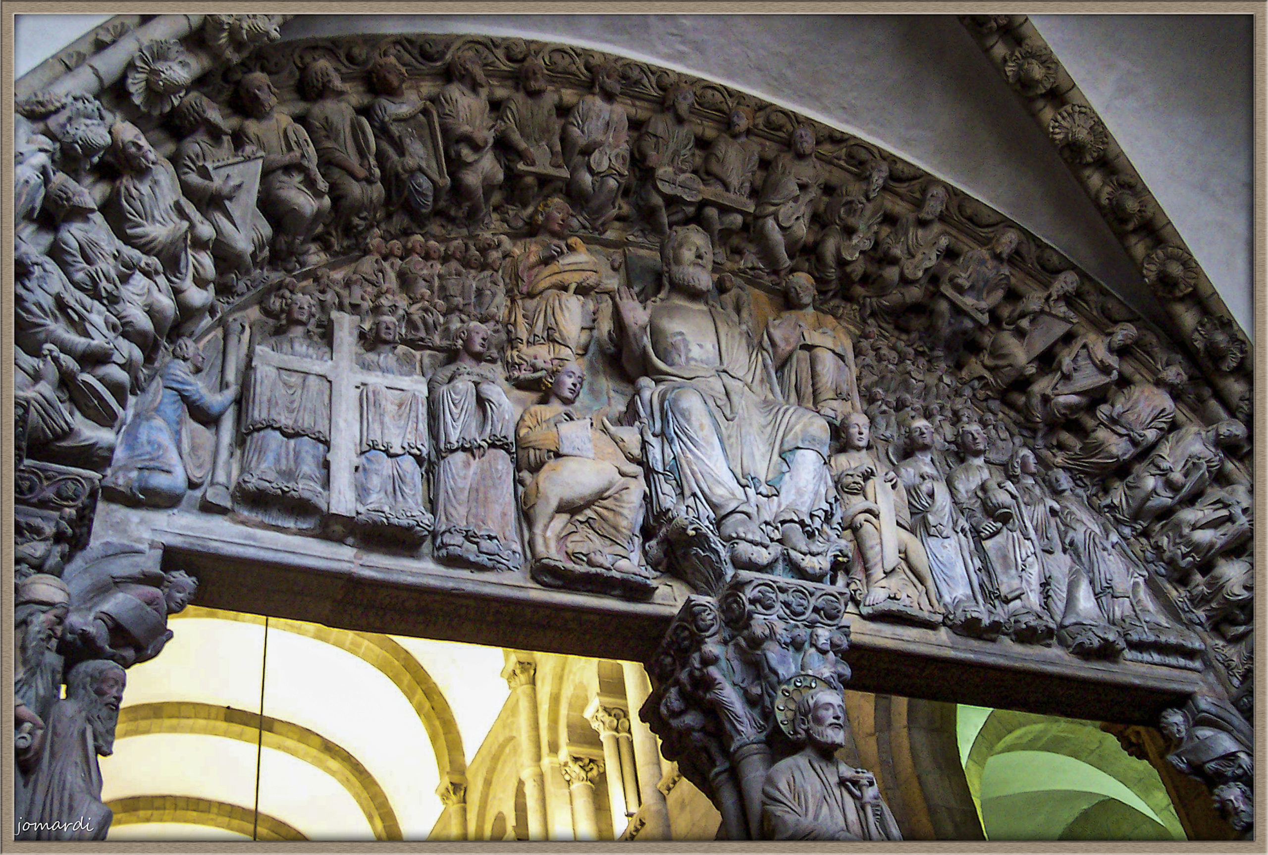 El Barroco no derrumbó, sino que actualizó la imagen de la catedral, unificó el contorno exterior, plagado de construcciones anexas, y configuró espacios públicos amables, plazas en el corazón de la ciudad, como la del Obradoiro. De este estilo es la figura de Santiago Peregrino arriba, con Teodoro y Atanasio al lado del arca y dos reyes abajo, símbolo de la sumisión de la Corona al poder de la Iglesia.
