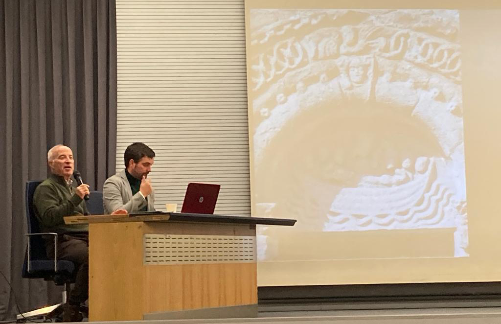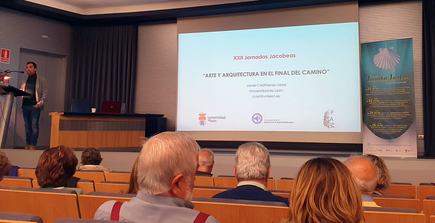 Javier Castiñeiras López, en su conferencia titulada “Arte y arquitectura en el final del Camino,” nos ofrece un panorama visual del arte y las construcciones que aparecen desde León a Finisterre y que nos muestran varios estilos artísticos. En estos edificios se van encontrando alusiones al apóstol Santiago, aparece una visión de luminarias, tres tumbas que hacen referencia también a sus discípulos Atanasio y Teodoro, el obispo Teodomiro, gran impulsor del templo, etc.