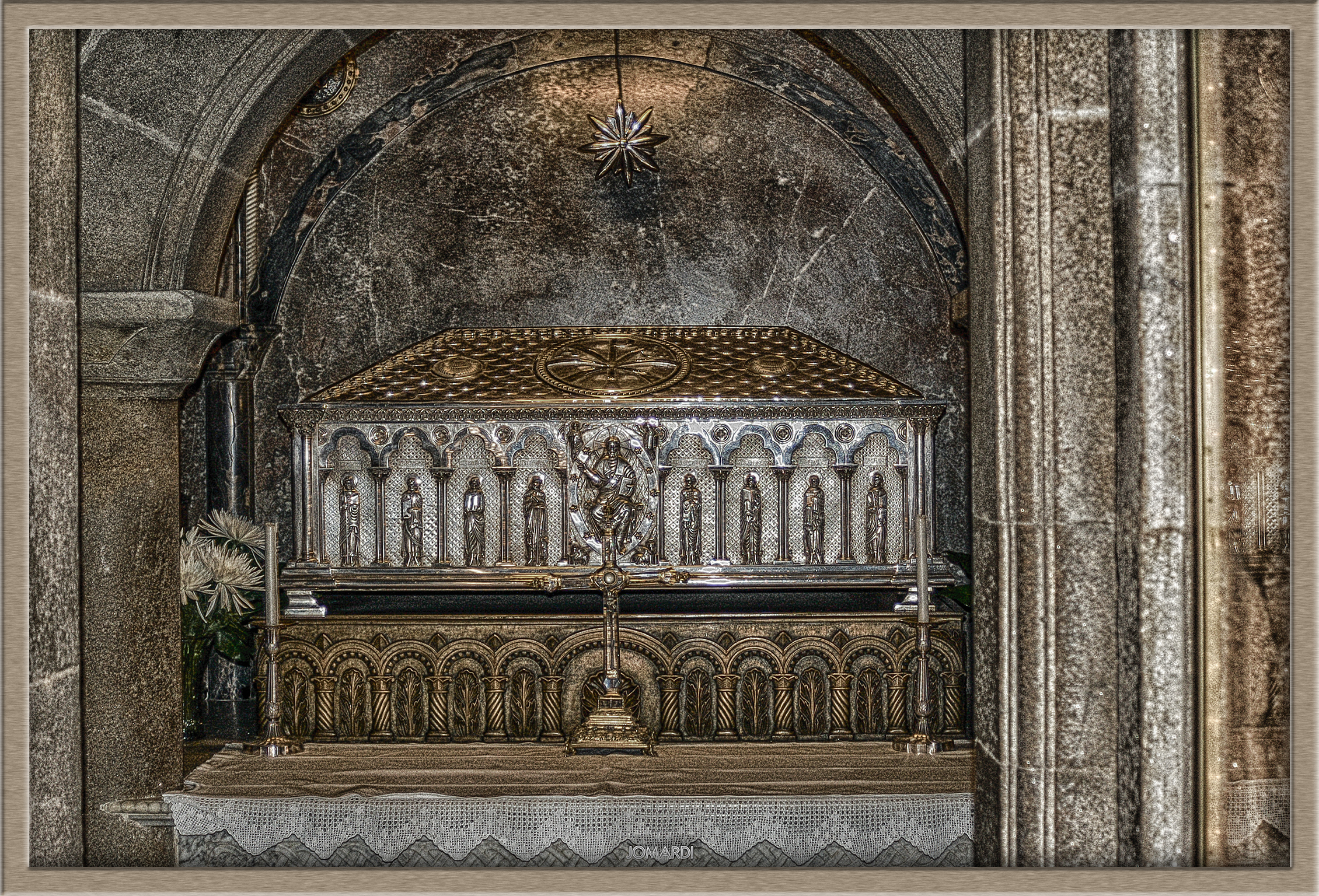 Alfonso II inició una monumentalización del espacio mortuorio que fue la génesis de una antigua iglesia. En tiempos de Alfonso III se edifica una catedral románica, más audaz, de extraordinario tamaño, tomando como modelo la de San Salvador de Valdediós. Esta catedral románica se oculta hoy tras el estilo barroco posterior, pero podemos apreciarla en la portada de Platerías. Esta constituye un puzle formado por muchos de los relieves desmontados de otras zonas del templo.